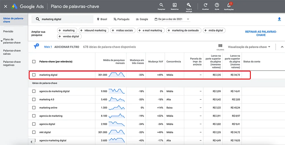 Com esse planejador é possível analisar o volume de pesquisas de termos por região, além disso, é possível ter uma estimativa de valores de lance e nível de competitividade no leilão.